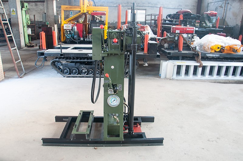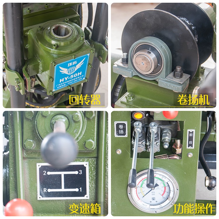 广州环屿钻探机械有限公司生产的HY-50H型钻机,是在50系列钻机的基础上升级改造的,解决了传统小型液压钻机钻杆短,钻进时需要反复提钻下钻的作业模式,该机型新增了履带底盘,减轻了用户的转场负担,提高了作业效率,钻杆取芯钻具等放在底盘上,发动机器可以转场了,同时增加了移机功能,在我工厂的制造下,钻杆长度达到3米,钻塔高度4.5米,精简了作业流程,换杆不需要拆卸牛头回转器,提升了钻进速度。
