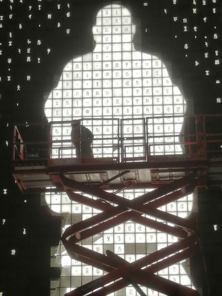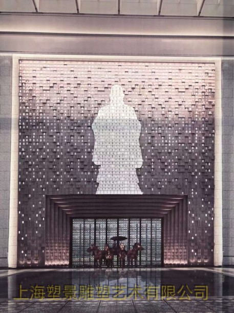孟子博物馆门头雕塑,使用铸铝材质制作,以铸铝块拼接完成整个孟子形象,拼接无缝隙,以效果图为准铸铝块拼接出高低不同的凹凸面,每一个铝块上都有一个古文字,拼接出的孟子雕像,整体磅礴大,在门头上远远的可看见。