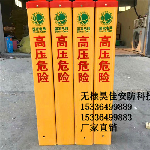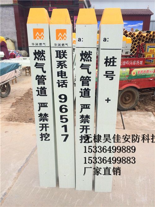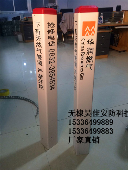 玻璃钢标志桩:经高温压制而成。抗冲击,耐磨损,耐高温,耐腐蚀,可以抗水、汽油、酒精、电解盐、醋酸、盐酸、钠钾化合物、尿、沥青,适合各种酸碱土壤。使用寿命长达30年。内容采用丝网印刷技术,警示效果好,不需要维护。重量轻,便于运输安装。无回收价值,自然防盗。
