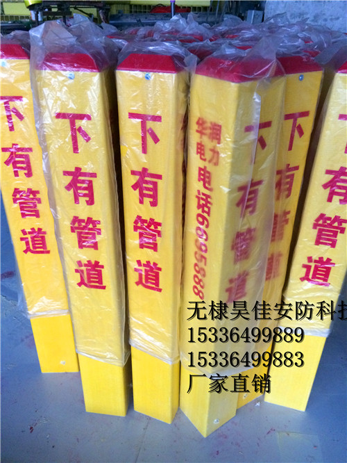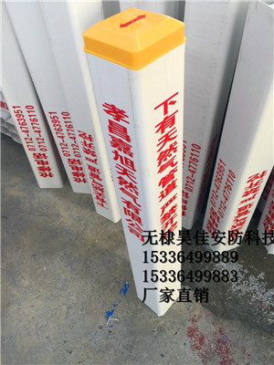 玻璃钢标志桩:经高温压制而成。抗冲击,耐磨损,耐高温,耐腐蚀,可以抗水、汽油、酒精、电解盐、醋酸、盐酸、钠钾化合物、尿、沥青,适合各种酸碱土壤。使用寿命长达30年。内容采用丝网印刷技术,警示效果好,不需要维护。重量轻,便于运输安装。无回收价值,自然防盗。