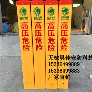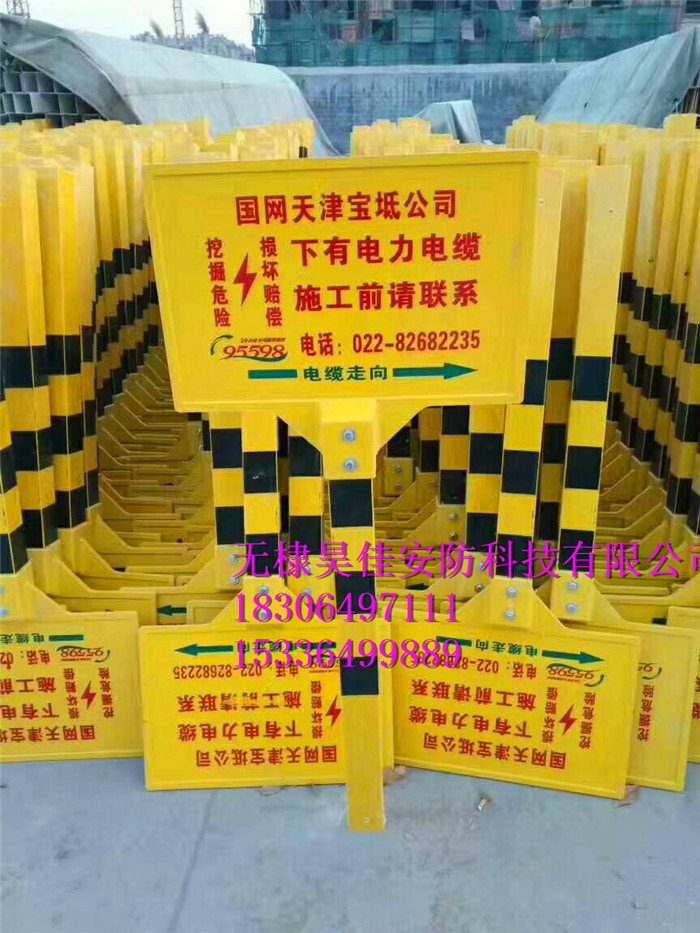 玻璃钢标志桩:经高温压制而成。抗冲击,耐磨损,耐高温,耐腐蚀,可以抗水、汽油、酒精、电解盐、醋酸、盐酸、钠钾化合物、尿、沥青,适合各种酸碱土壤。使用寿命长达30年。内容采用丝网印刷技术,警示效果好,不需要维护。重量轻,便于运输安装。无回收价值,自然防盗。