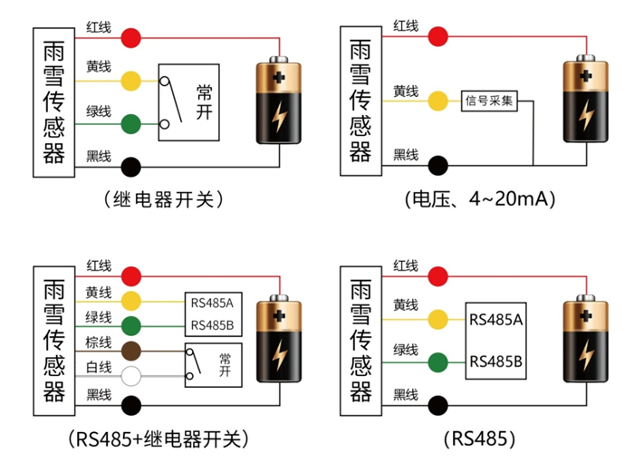 OSA-24雨雪传感器可连接各种载有差分输入的数据采集器,数据采集卡,远程数据采集模块等设备,接线说明如下图: