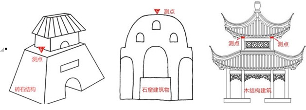 (4) 测点数量:古建筑物振动监测测点数量应根据结构类型、修建年代、保护级别、建筑材料、结构高度、抗震等级等综合考虑。对于爆破振动监测,在靠近爆源一侧的外部地基表面布置 1~2 个监测点。