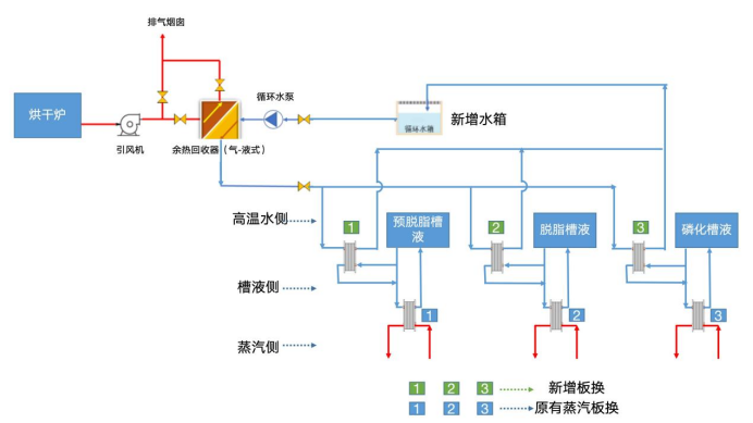 涂装车间电泳、中涂、面漆烘干炉排放的高温烟直接排向大,造成了热量的浪费,然而涂装车间前理工艺又需要大量的热水,为了将烟的热量有效的回收利用,可以在烘干炉末端新增的余热回收装置进水换热,用于加热前理工艺回水,提高锅炉回水温度,从而,降低涂装车间锅炉加热工艺用水的能源消耗,为企业节能增效、降本增利,实现余热的利用,助力汽车工业绿色发展,支持双碳经济及可持续发展战略。
