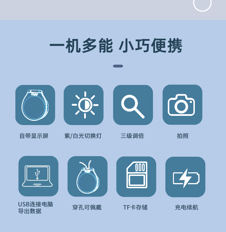 内置3颗白色LED和3颗UV LED,通过按键自由切换光源模式(白光→UV光→关闭)。