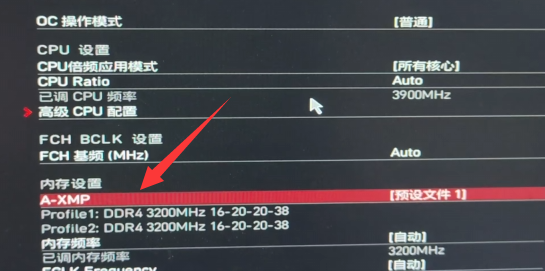 4、在这里的内存设置中找到xmp功能,将它开启,如果这里不是开关是预设模式的话就随便选一个模式即可。