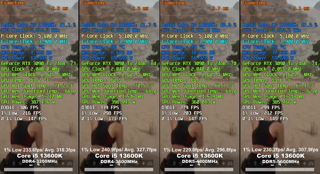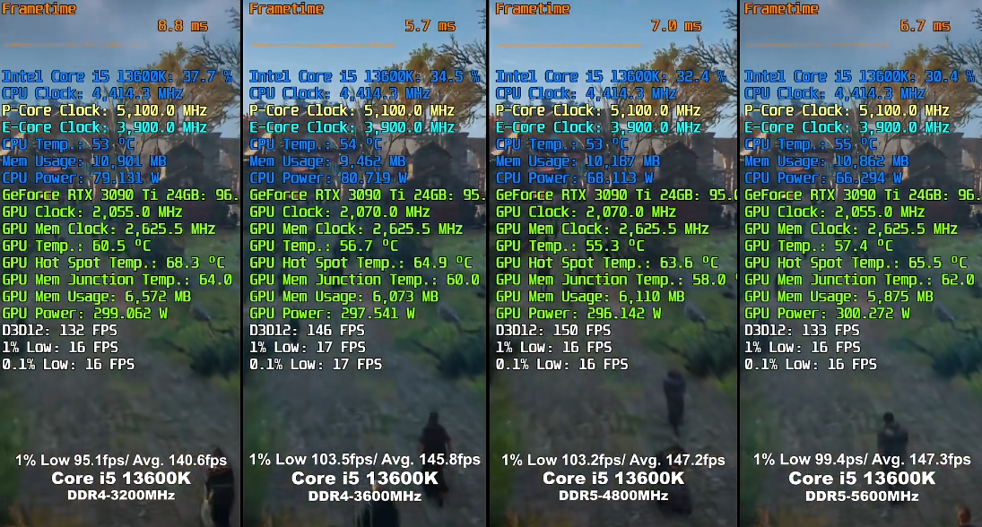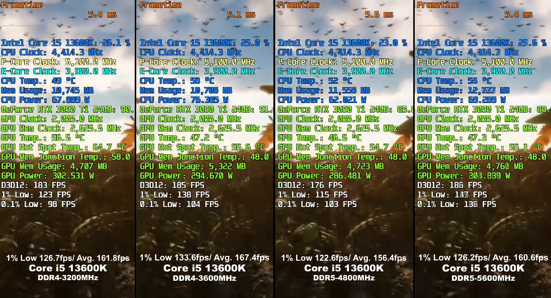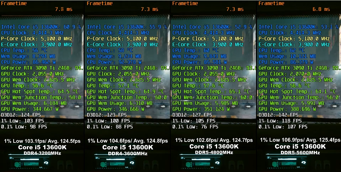可以看到,ddr5 5600在较高性能需求的游戏中比ddr4 3200强,但在较低配置需求的游戏里甚至帧率不如ddr4 3200,而且互相之间的区别不大,在5%以内。