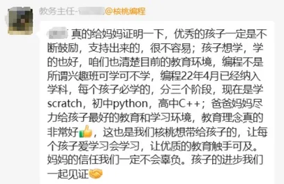 当家长未接听销售电话时,核桃编程的销售人员还会尝试联系其他家庭成员。"如果没接推销电话,咨询老师还会继续骚扰其他家人来推销课程,"该家长表示,这种做法让人感到极为不适。