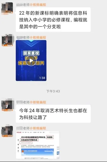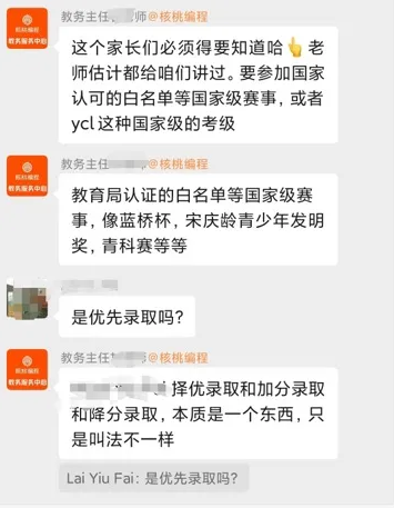 核桃编程的咨询老师不断强调编程对小升初、中考和高考的重要性,通过白名单赛事获奖可以"降分录取",以及通过强基计划进入全国顶尖985高校的机会。"他们给家长制造其他升学方式压力很大的氛围,但通过学编程可以走捷径升学,"这位家长无奈地表示,"这让家长苦不堪言,身心疲惫。"
