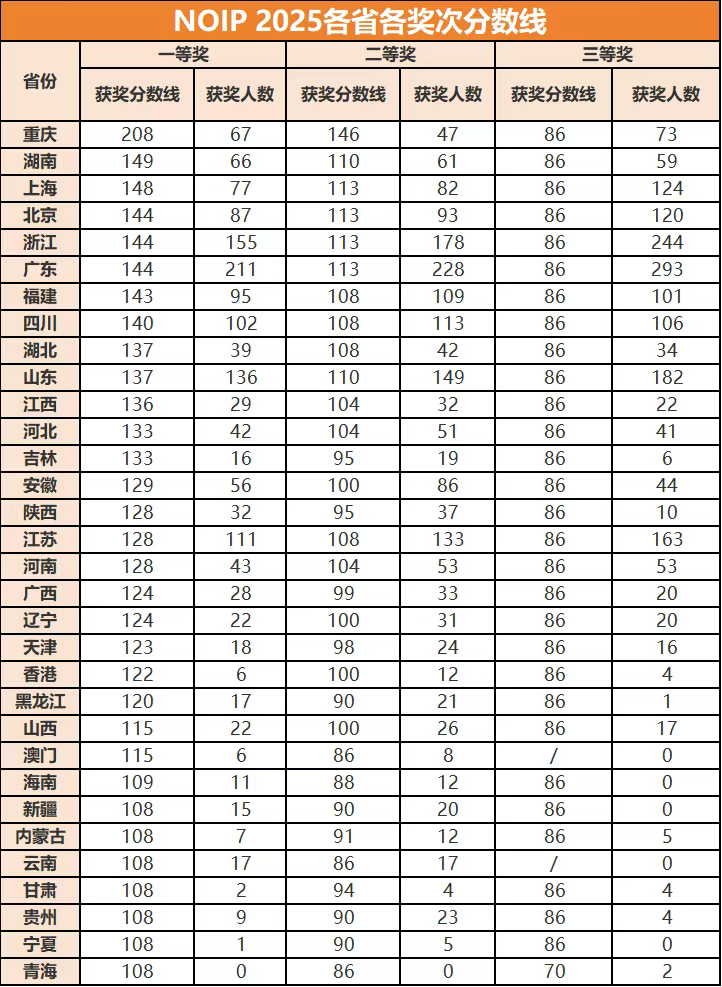 🚩广东省以732人总获奖数位居全国第一,一等奖211人、二等奖228人、三等奖293人,展现出强大的整体实力。 🚩浙江省577人紧随其后,一等奖155人,凭借深厚的竞赛基础保持领先。 🚩山东省467人位列第三,各奖项人数分布均衡,竞赛氛围浓厚。 值得注意的是,不同省份的一等奖分数线存在显著差异:重庆以208分的高分线领跑,湖南149分、上海148分,而青海、宁夏等省份一等奖分数线与全国基准线持平(108分)。 这种差距背后,是教育资源、师资力量和学习氛围的地域差异,形成了"强者愈强"的马太效应。 对非头部省份的家长来说,不必过度焦虑地域差距——随着信息学教育的普及,越来越多非传统强校的学生跻身获奖名单,只要为孩子搭建合适的学习平台,天赋与努力同样能打破地域限制。 02.年级分布:高一成主力,启蒙提前成趋势 获奖数据清晰呈现了竞赛的年级特征:高一学生占总获奖人数的50.67%,成为绝对主力。 其中一等奖获得者中,高一725人、高二698人、高三122人;二等奖高一914人、高二750人、高三97人,这一现象背后藏着两个关键信号: 1️⃣学科启蒙逐渐提前:越来越多学生在小学阶段就开始接触编程,为初中阶段的深度学习和高中参赛积累基础。 2️⃣竞赛规划需趁早:由于选手仅有高一、高二两次核心参赛机会,提前布局备考、尽早积累赛事经验,成为冲击高奖项的关键。 这给中小学家长的启示尤为明确:信息学竞赛的准备不是"高中才开始"的突击任务,而是需要长期规划的成长路径。小学阶段培养兴趣、初中阶段夯实基础,才能让孩子在高中参赛时具备竞争力。 03.“特殊优势群体”满分选手抢眼,女生竞争力提升 本次比赛共有11名选手斩获400分满分,他们全部来自北京、上海、浙江、广东、江苏、福建等竞赛强省,分别就读于北京市十一学校、南京外国语学校、杭州第二中学等传统名校。 这些满分选手多为高二学生,印证了"早起步、稳进阶"的培养规律,也为有天赋的孩子提供了可参考的成长范本。 同步进行的第五届NOI女生赛中,共有86名女生获得一等奖。尽管女生参赛比例仍相对偏低,但竞争力持续增强:北京中学胡筝以340分的高分领跑,广州大学附属中学刘君仪、山东省平邑第一中学罗一康等选手均取得优异成绩。 根据规则,女生赛将按成绩选取5-10名选手(已入选省队者递补),以B类身份参加当年NOI,且每个省份入选人数不超过2名。这一政策为女生参与信息学竞赛提供了更多机会,也鼓励更多女孩勇敢追逐编程梦想。 04.家长的核心建议:理性规划,关注长远成长 1️⃣正视竞赛价值,但不功利化追求 NOIP奖项不仅是升学加分的凭证,更能培养孩子的逻辑思维、解决问题的能力、驾驭AI的能力、想象力创新力、思辨力、学习力和沟通协作能力,这些核心素养将受益终身。 2️⃣结合孩子特点选择 信息学竞赛适合对编程有兴趣、逻辑思维突出的孩子,不必盲目跟风,尊重孩子的自主选择才是关键。 3️⃣重视早期启蒙与系统学习 从小学阶段接触编程、培养兴趣,初中阶段进行系统训练,高中阶段冲刺赛事,循序渐进的规划更易出成果。 4️⃣关注地域差异与资源平衡 非头部省份的家长可借助线上课程、专业教练指导等资源,为孩子搭建优质的学习平台,弥补地域差距。 💡小码王在线直播课可以帮孩子打破地域壁垒,同步金牌教练优质师资,让孩子直接看齐强省同龄人水准,地域不再是局限! 真正的教育公平,不是让所有孩子都拿奖,而是让每个有天赋的孩子都有机会被看见、被培养。 NOIP2025的获奖数据,既展现了信息学竞赛的蓬勃发展,也为中小学家长提供了清晰的培养指引。无论孩子是否走竞赛之路,这份对逻辑思维、科学素养的培养重视,都将成为孩子未来成长的宝贵财富。 愿每个热爱编程的孩子都能在信息学的世界里收获成长,愿每位用心规划的家长都能找到适合孩子的成长路径!1️⃣满分学霸的共同特质