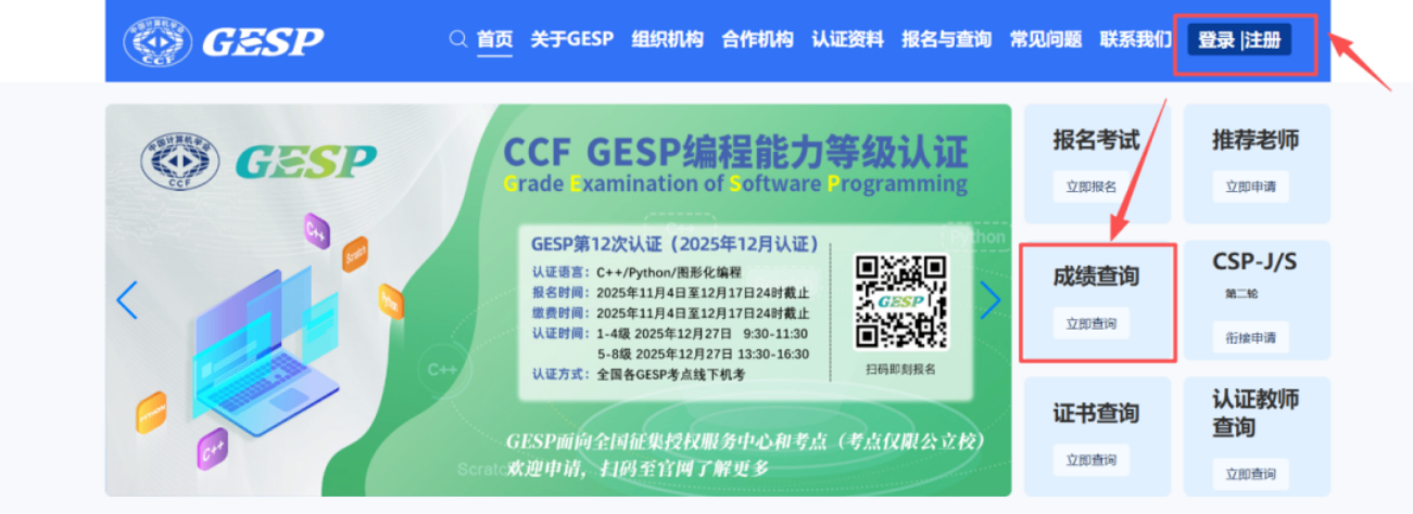 登录CCF GESP官方网站(https://gesp.ccf.org.cn),在首页找到"成绩查询"入口,输入孩子的GESP报名账号和密码即可。