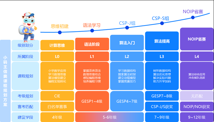 完整进阶路径:从CSP-J到IOI一站直达:同时,小码王打造了从CSP-J/S到NOIP,再到NOI/IOI的完整、科学的阶梯式课程路径,还针对12周岁以下及以上学员推出XM/XP双轨道分层课程,从基础语法构建到算法进阶,从赛事冲刺到拔尖培养,形成全周期、梯度化的进阶体系,让不同年龄段、不同基础的学员都能找到适配的学习路径,稳步提升竞赛能力。