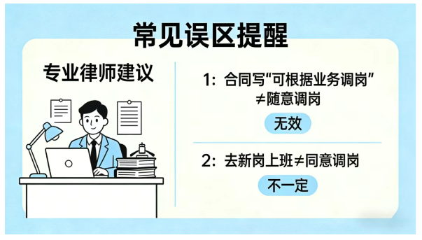 误区1:公司说“劳动合同里写了‘可根据业务需要调岗’,所以能随意调岗”