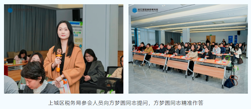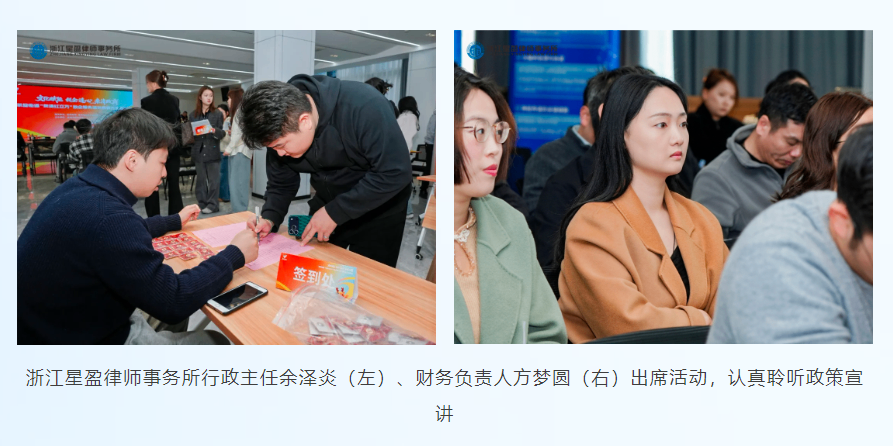 政企税三方齐聚 共话发展 活动现场亮点纷呈,涵盖暖场视频、政策宣讲、政企座谈等六大环节,解读文创、税务新政及AI赋能知识,为企业提供专业服务。浙江星盈律师事务所作为服务业标杆受邀参会,行政主任余泽炎、财务负责人方梦圆出席,彰显官方对律所专业能力与口碑的高度认可。 活动期间,上城区税务局参会人员就律所税务相关问题向方梦圆同志提问,方梦圆结合工作实际与行业规范精准作答,获现场一致认可。主办方随后为星盈律所颁发“亲清先锋服务岗”徽章,既是对律所社会责任的肯定,也是对其专业能力的认可。 颁发“亲清先锋服务岗”徽章 活动结尾,星盈律所作为服务业代表,由财务方梦圆与其他领域代表一同上台,作出庄严承诺,自愿接受党组织考验、企业监督、群众评判,彰显了律所践行社会责任的初心。 律所担当 星盈律所自成立以来,秉持高度社会责任感,深耕法律专业建设,积极参与官方助企普法活动。此前,上城区常委毛素云、省商务厅庄谨处长一行先后莅临律所,高度肯定其专业能力。此次参会,再次印证了律所的正规性与权威性。未来,星盈律所将坚守初心,以专业法律服务护航企业发展,助力构建亲清政商关系。