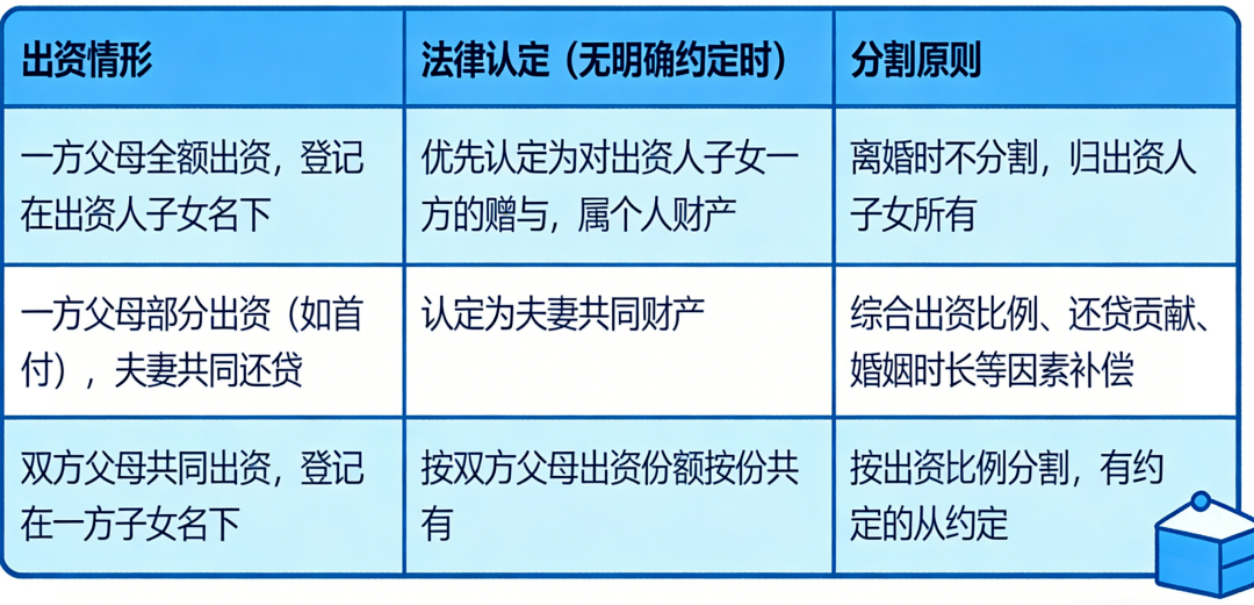 父母出资购房时,需书面明确“仅赠与本人子女一方”,并由夫妻双方签字确认,避免因赠与主体模糊引发纠纷。