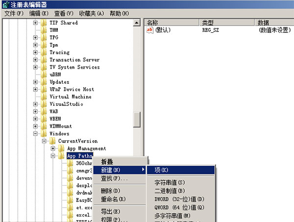 2、确认下你的软件是否在该注册项下,如果没有,请添加;有责可以修改指定路径等。比如我们想通过运行命令直接打开:微信、QQ...等,我们就在AppPaths下新建-->项-->名字最好方便自己记忆或与应用相关(wechat.exe)-->再快速单击两下右边的:默认-->填入应用程序的实际安装路径启动的.exe可执行文件即可。