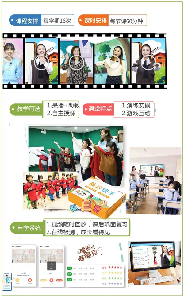这套课程采取线上+线下双师教学模式:线上老师提供标准示范,线下老师进行教学辅导、练习纠正。我们还为线下的老师提供了全套的教案和课件,教学环节设计从兴趣出发,将知识性、趣味性、演绎性和实用性融为一体,让孩子自信表达、智慧演说!
