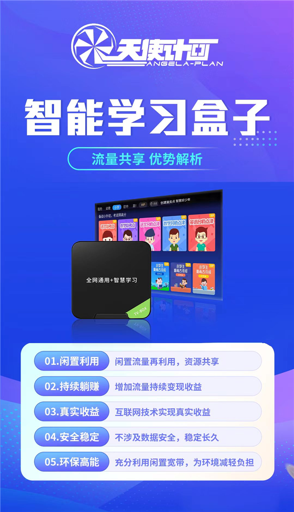 类似于无线宝,是个做流量变现的产品。天使计画学习盒子这个项目,是由天使计画教育科技与金山云共同研发出来的一款高科技产品,可以采集家里的闲置上行流量,专业名称叫做CDN,所有带云的企业都需要这个东西,比如阿里云,华为云,金山云等等通过采集家里的闲置流量,卖给带云的企业产生营收!你也可以理解为,大公司在租用你家的网,付给你租金!