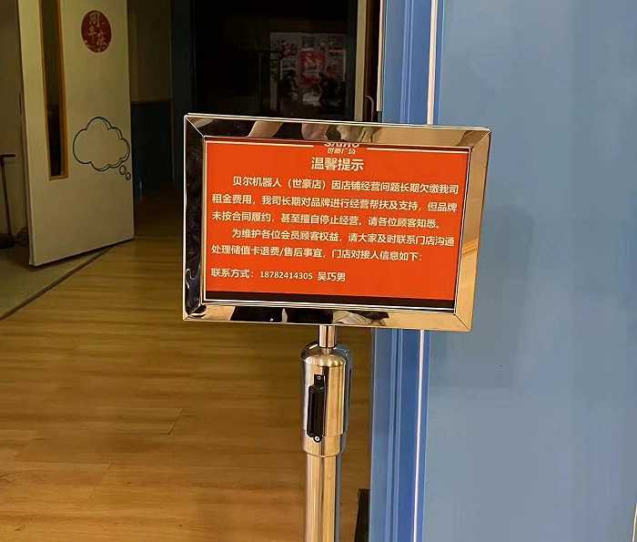 贝尔机器人世豪校区也长期欠缴租金费用,擅自停止经营,商场发通告提醒消费者,沟通退费售后事宜。