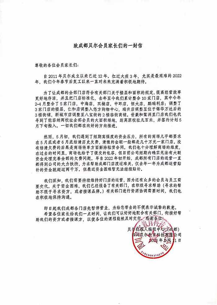 不止成都,据大皖新闻援引家长消息,合肥贝尔机器人所有门店暂时停止营业。