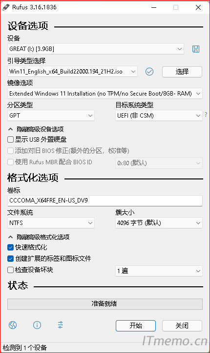 使用著名的刻录工具rufus,官网地址Rufus - 轻松创建USB启动盘,下载版本最低3.16,镜像选项中有两种方式可供选择,一种就是正常安装(PC已经满足win11安装的各种要求),第二种就是略过TPM和Secure Boot,如图所示;