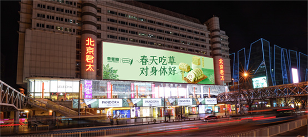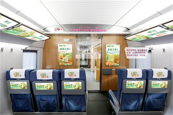 在全国九大城市,爸爸糖锁定热门商圈,投放城市大屏。整体青绿色的图文信息到了夜晚格外醒目,过路行人纷纷驻足观看。不仅如此,为了辐射更多人群,爸爸糖与中国高铁合作多组爸爸糖冠名品牌列车,与无锡地铁共同打造一辆“开往春天的地铁”,车内绿意盎然的360°全景画面,给人以强烈的视觉冲击。