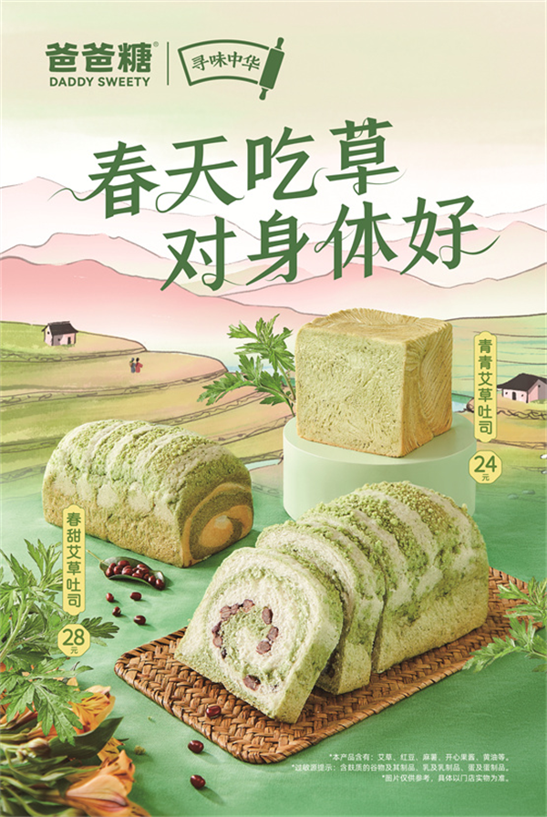 在《诗经》和《本草纲目》中,均有对艾草的记载,早在古代,各地也早就有清明吃艾草的传统习俗。如江浙吃青团,两广吃艾草饺子等。到现代,春季吃艾草,已成为各地人民的广泛认知。爸爸糖将历史悠久的艾草作为春天的标志性产物,并将其融进吐司,让消费者在感受文化自信,弘扬民族自豪感的同时,进一步对传统饮食文化产生精神共鸣。