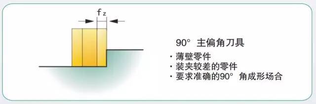 在铣削带方肩的平面时选用 90°主偏角。该类刀具通用性好,在单件、小批量加工中选用。由于该类刀具的径向切削力等于切削力,进给抗力大,易振动,因而要求机床具有较大功率和足够的刚性。