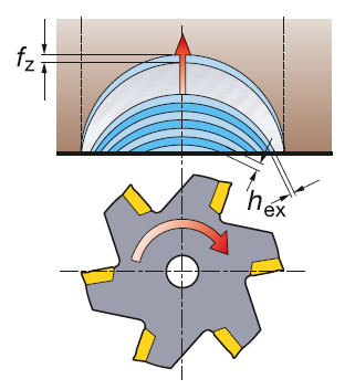 当铣刀的切入角小于90°时,由于切屑变薄,轴向切屑厚度会小于 铣刀的进给率,则铣刀切入角将对其适用的每齿进给量产生很大的影响。