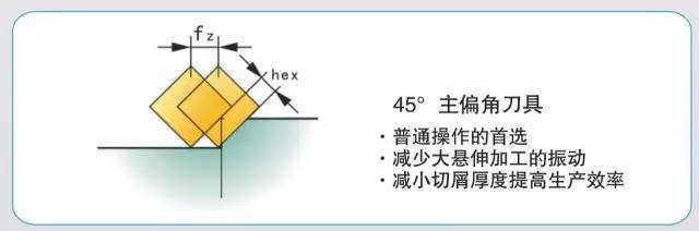 在面铣加工中,切入角为45°的面铣刀会使切屑变得更薄。随着切入角的减小,切屑厚度会小于每齿进给量,而这反过来可以使进给率提高到原来的1.4倍。 45°主偏角铣刀的径向切削力大幅度减小,约等于轴向切削力,切削载荷分布在较长的切削刃上,具有很好的抗振性,适用于镗铣床主轴悬 伸较长的加工场合。用该类刀具加工平面时,刀片破损率低,耐用度高; 在加工铸铁件时,工件边缘不易产生崩刃。
