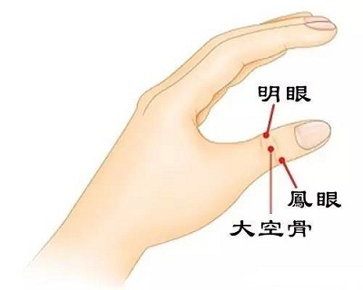 明眼穴位于左右手的大拇指中间的骨节上。用一手的拇指和食指夹住,以拇指的指甲分别对这个养生穴位进行刺激,以稍微感觉到疼痛即可。可以在工作的休息时间,或是等车的空档期自行按摩。
