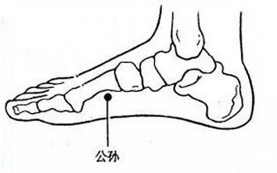 公孙穴位于人体的足内侧缘,当第一跖骨基底部的前下方。主治呕吐,胃痛腹痛,泄泻痢疾。在办公室取坐姿,两手拇指分别按住公孙穴,深呼吸渐渐用力揉按20~30次,每次每穴按压5~10分钟。