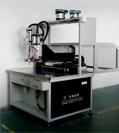 将已加热好的铜螺母从机头压入塑料壳上。压入温度可调节,并加限位装置。