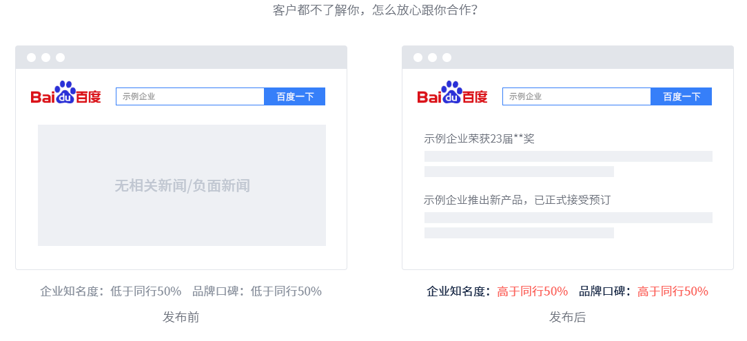 一篇内容丰富的软文能够详细的阐述公司的背景、产品线、服务宗旨等,并且借助第三方官方权威的媒体(如新浪、搜狐、网易、凤凰)传播出去,能够增加用户对企业、品牌的信任度。举个例子,如果用户在百度搜索企业名称、或者品牌名的时候都看不到相关的资讯,客户没有办法去了解您,怎么放心跟您合作!如果客户看到的是各大新闻门户报道的最新讯息,客户对公司、品牌的第一印象至少会增加20%的分值。