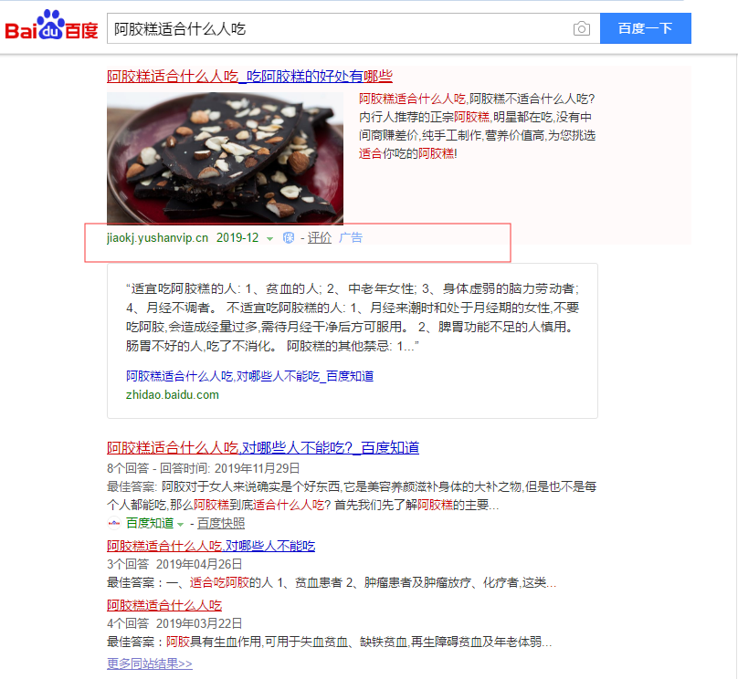 “阿胶糕适合什么人吃“2万多一天的搜索量,去百度一下这个词,我现在广州搜索,发现只有一个百度竞价。(不排除其他地方有更多或者当你看的时候可能会更多)。