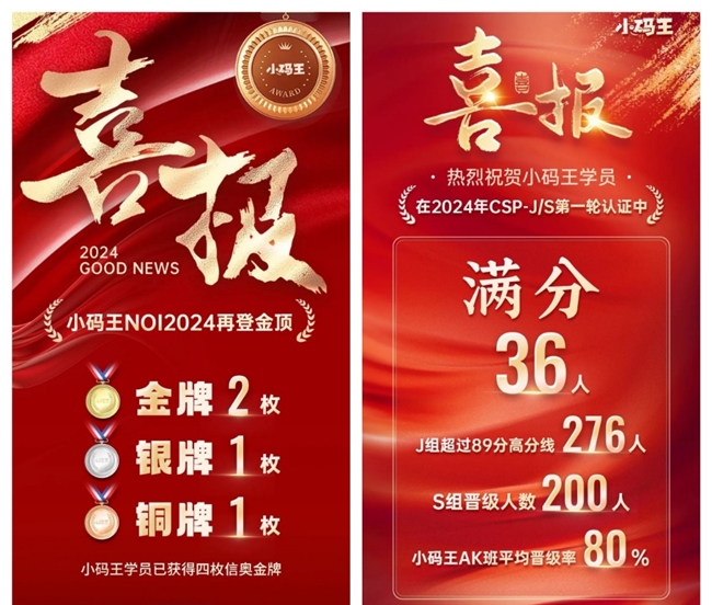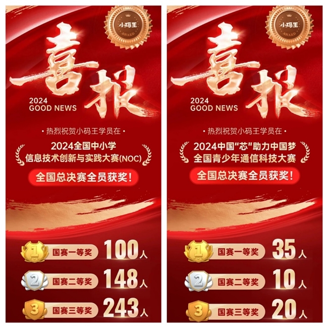 多年来,小码王持续为全国青少年信息学奥林匹克竞赛(NOI)、全国青少年信息学奥林匹克联赛(NOIP)、CSP-J/S等众多信息学顶级赛事输送了大量人才和高分选手。在连续两年NOI竞赛中,在连续两年的NOI竞赛中,小码王学员夺得四金、三银、两铜的成绩。在今年的CSP-J/S认证中,小码王学员也展现出了非凡实力。此外,在教育部白名单中的各项科技类赛事,以及全国各地的科学赛事活动中,小码王的学员们同样以卓越的表现,彰显了他们在编程领域的过人实力。
