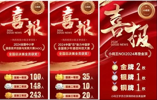 教育成果显著,孩子喜欢、家长信赖。成立以来,小码王的学员无论是在国内的信息学奥林匹克竞赛中,还是在CSP-J/S等级考核、以及教育部各大白名单赛事和各种地方科技类赛事中屡获佳绩:在连续两年的NOI竞赛中,小码王学员夺得四金、三银、两铜的傲人成绩;在今年CSP考级赛中,小码王初赛、复赛获奖率均为90%以上……这些成绩不仅为学员个人赢得了荣誉,也为小码王在编程教育行业树立了良好的口碑,吸引了更多家长和孩子选择小码王的编程课程。