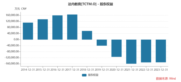 此外,净利润回正亦未能掩盖公司居高不下的负债率。WIND数据显示,自2019年,童程童美的资产负债率就超过了100%,达到116.05%,此后公司资产负债率逐年攀升,2023财年达到247.45%。公司净资产(股东权益)亦连续五年亏损,2023财年的净资产为-15亿元。