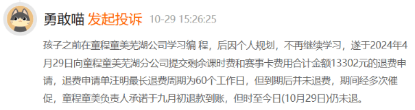 另有消费者于2024年4月29日向童程童美芜湖分公司提交剩余课时费和赛事卡费用合计金额13302元的退费申请,退费申请单注明最长退费周期为60个工作日,但到期后并未退费,期间经多次催促,童程童美负责人承诺于九月初退款到账,但时至今日(10月29日)仍未退。