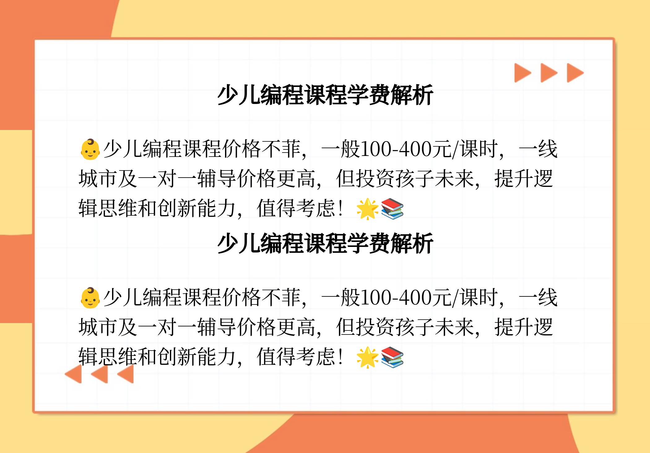 首先,从整体价格范围来看,少儿编程课程的学费一般在100元至400元每节课之间。例如,一些一线城市少儿编程课程的价格可能在每课时150元至400元,而一对一辅导课程的价格可能更高,达到每课时3000元至4000元。以童程童美少儿编程为例,他们的收费标准在10000至50000元之间,根据不同的课程和课时数量有所差异。例如,3+乐高创意启蒙课程的费用大约是13200元,每课时165元左右;而Scratch图形化编程和Python人工智能编程课程的费用在19200元左右,每课时240元左右。