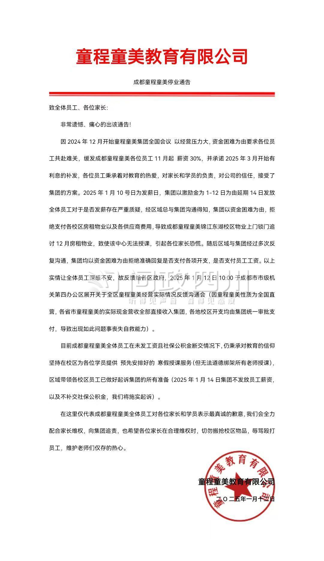 在2024年11月18日通过【校外培训家长端】App向【成都市双流区童程童美科技培训学校有限公司】缴纳4笔课时费一共19200元,上了几次课,于2025年1月12日凌晨4点,由学校老师发布童程童美经营不善,导致全国全部未发薪资,从2025年1月13日开始大龄同学线上上课,小领同学停止上课,但是并未提及退费,老师让我们家长维权。