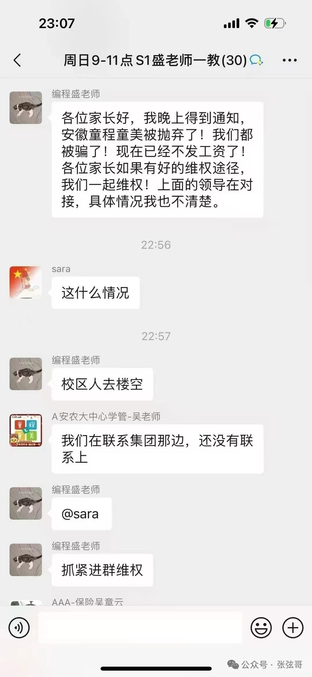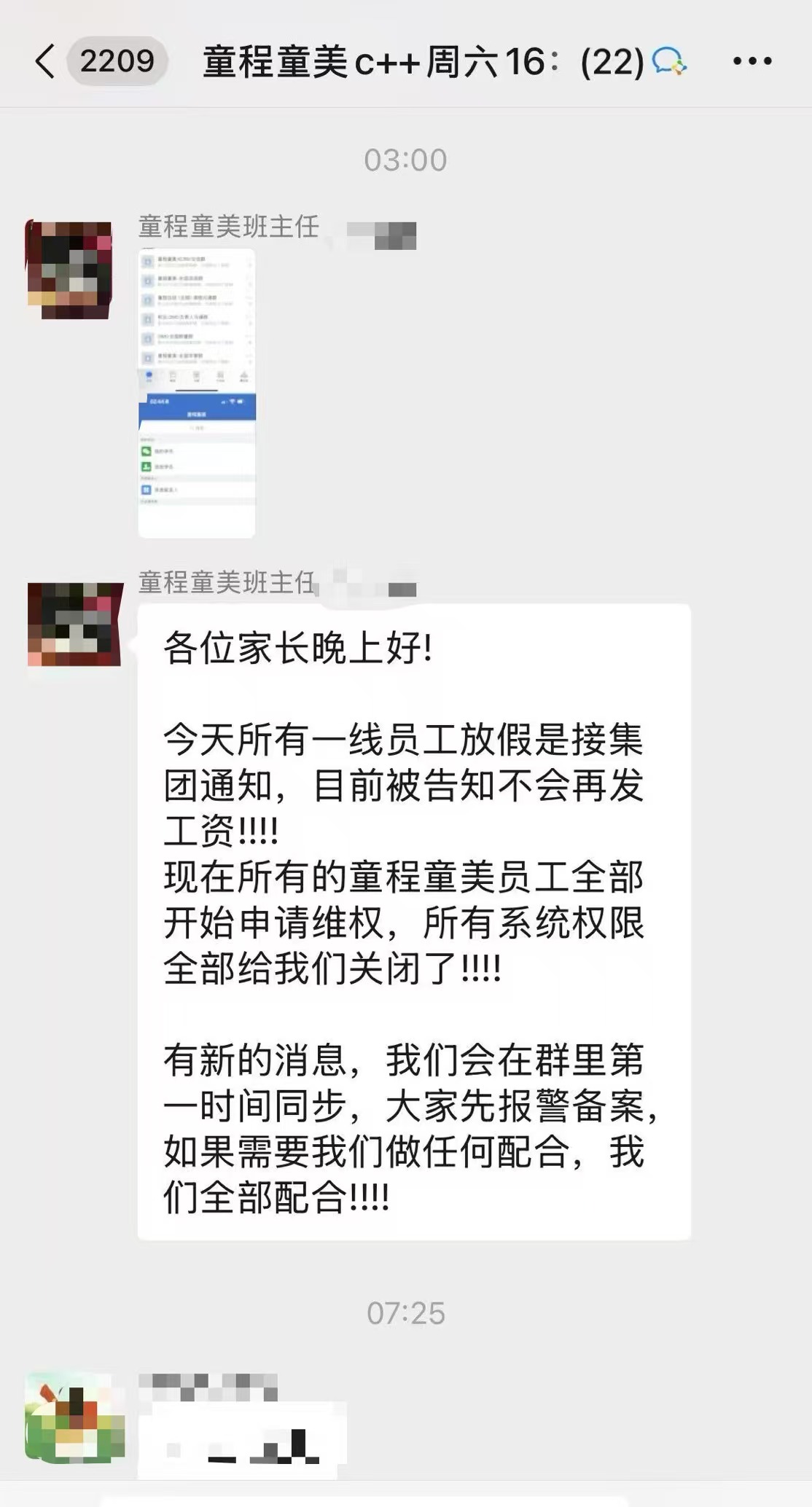 据了解,童程童美是一家少儿编程培训机构,门店遍布全国,在合肥就有7家店。当天合肥多个校区的家长都接到了老师群发的信息:“今天所有一线员工放假是接集团通知,目前被告知不会再发工资。童程童美员工开始申请维权,所有系统权限全部给我们关闭了!”