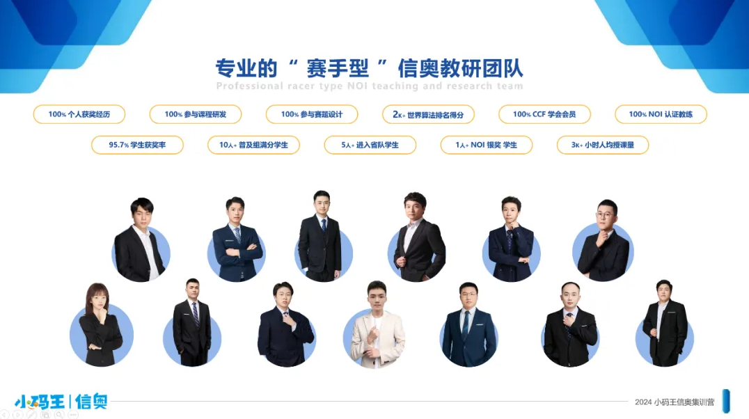 小码王自成立以来,一直为各类赛事输送人才,并取得了不斐的成绩。无论是在国内的信息学奥林匹克竞赛中,还是在CSP-J/S等级考核、以及教育部各大白名单赛事和各种地方科技类赛事中,小码王的学员都展现出了出色的编程能力和创新精神。例如,在连续两年的NOI竞赛中,小码王学员夺得四金、三银、两铜的傲人成绩;在2023年第十四届蓝桥杯国赛中,小码王国赛学员100%获奖。