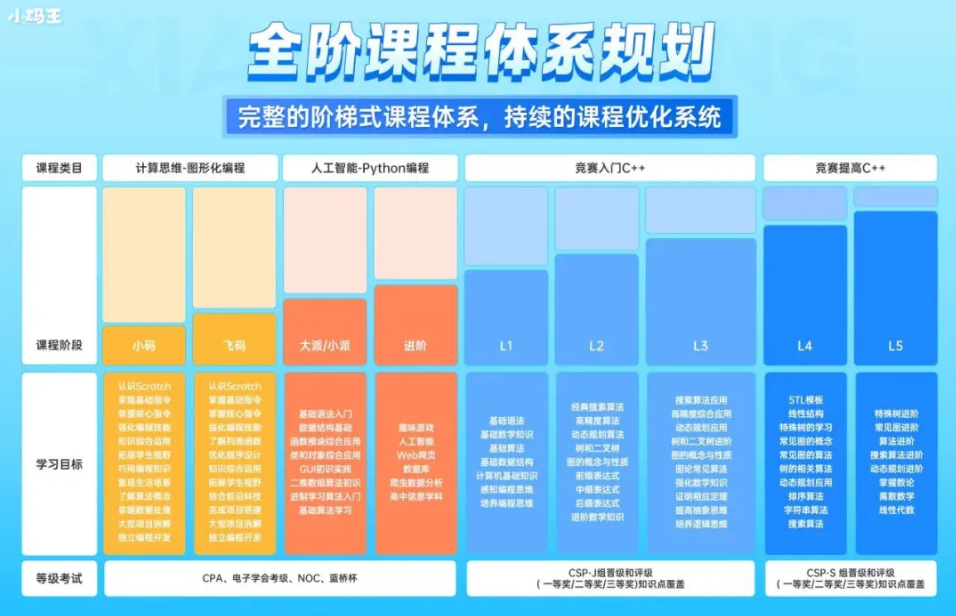小码王在编程教育领域拥有丰厚的教育资源,继而精心打造了一系列scratch图形化编程-Python-C++进阶的标准课程体系,深入探究儿童学习编程的成长轨迹,严格遵循各年龄段儿童的认知发展规律与接受能力的差异。目前,课程体系已经升级为4.0版本。同时,我们与多地政府部门、国内外知名高校、科研机构和企业建立了紧密的合作关系;自主开发优质的编程课程、教材;建立了完善的在线学习平台ACGO,提供丰富的在线课程和教学资源,方便学生进行自主学习和练习;此外,我们还定期举办各类编程讲座、工作坊和比赛活动,为学生提供更多的学习和交流机会。