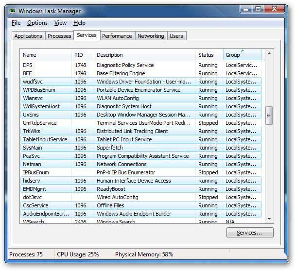 如果你使用的是Windows7,情况会有所不同。Windows 7任务管理器没有以相同的方式对进程进行分组,也没有显示常规进程名称,它只显示正在运行的“svchost.exe”的所有实例。你必须进行一些探索,以确定与“svchost.exe”的任何特定实例相关的服务。