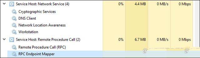 服务被组织到逻辑组中,这些逻辑组都有一定的相关性,然后创建一个服务主机实例来承载每个组。例如,一个服务主机进程运行与防火墙相关的三个服务。另一个服务主机进程可能运行与用户界面相关的所有服务,以此类推。例如,在下图中,你可以看到一个服务宿主进程运行几个相关的网络服务,而另一个进程运行与远程过程调用相关的服务。