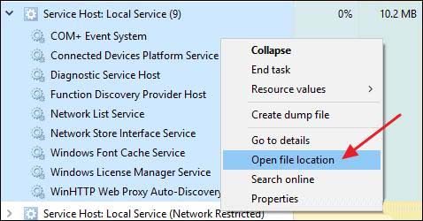 进程本身是Windows的官方组件。虽然病毒有可能用自己的可执行文件取代了真正的服务主机,但这种可能性很小。如果你想确定,可以检查出进程的底层文件位置。在任务管理器中,右键单击任何服务主机进程,然后选择“打开文件位置”选项。