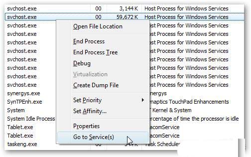 在Windows 7中任务管理器的“进程”选项卡上,右键单击特定的“svchost.exe”进程,然后选择“转到服务”选项。