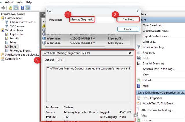 在查找框中键入“MemoryDiagnostic”,然后单击“查找下一个”。你将在窗口底部看到显示的结果以及有关内存的其他详细信息。