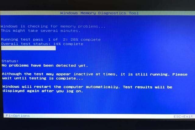 你的计算机将重新启动,Windows内存诊断工具屏幕将出现。让它顺其自然,让它来执行测试。这可能需要几分钟时间。在此过程中,你将看到一个进度条,如果在此过程中检测到任何问题,将显示一条“状态”消息。